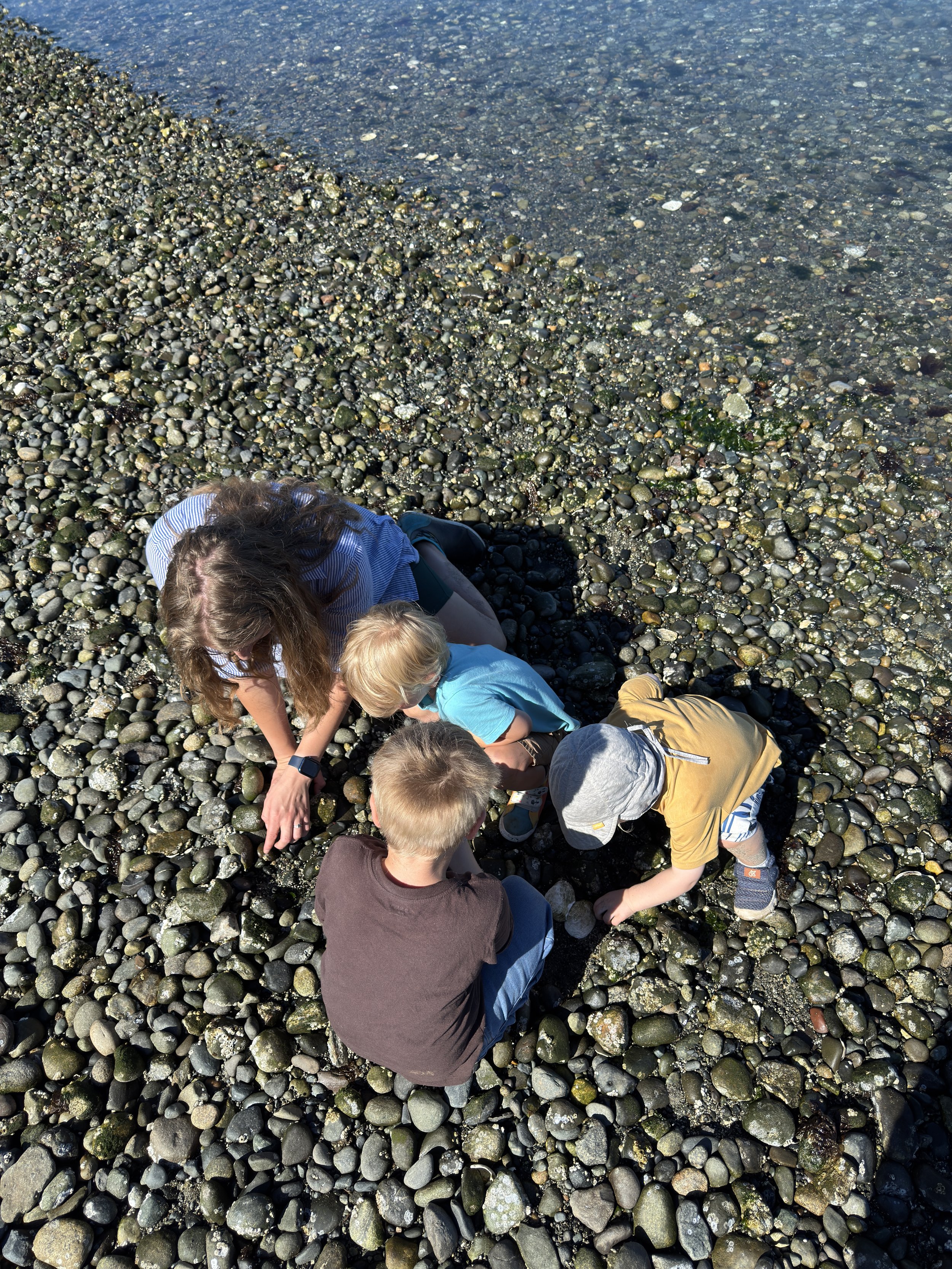 Why stay indoors when the best classroom is outside? Our “campus” is the great outdoors – including forest trails, beach tide pools, grassy fields, and covered picnic shelters. We chose our site at Salsbury Point Park for its natural beauty, safety, and endless learning potential. Children might observe sea creatures on the shore in the morning, then climb mossy logs in the afternoon. Rain or shine, our environment engages the senses and encourages adventure. (And don’t worry – we have sheltered areas for wet weather and always put safety first.)